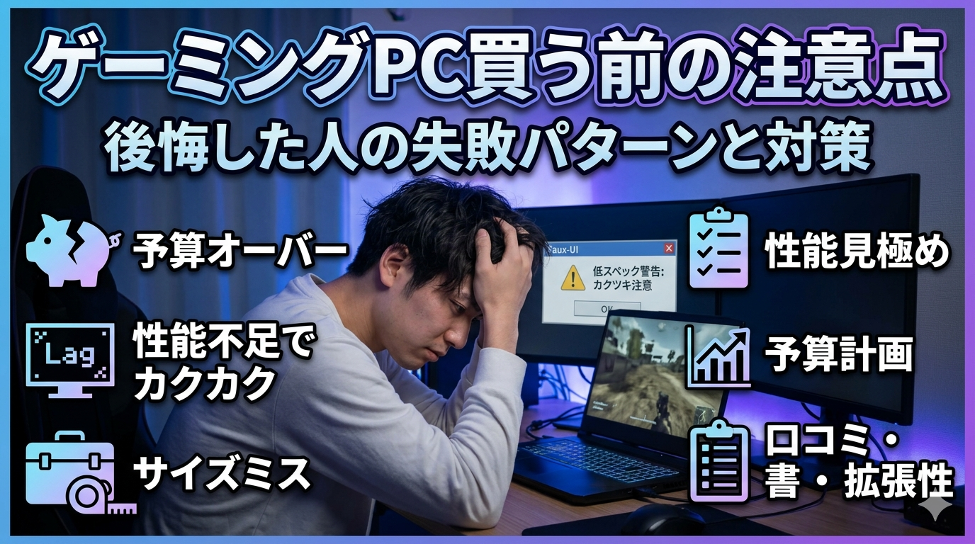 ゲーミングPCは10万〜40万円の高額な買い物です。「スペック不足で後悔した」「設置場所が合わなかった」といった声は後を絶ちません。この記事では、ゲーミングPCを買う前に確認すべき注意点を失敗パターンとセットで整理し、初心者でも後悔しない選び方を解説します。