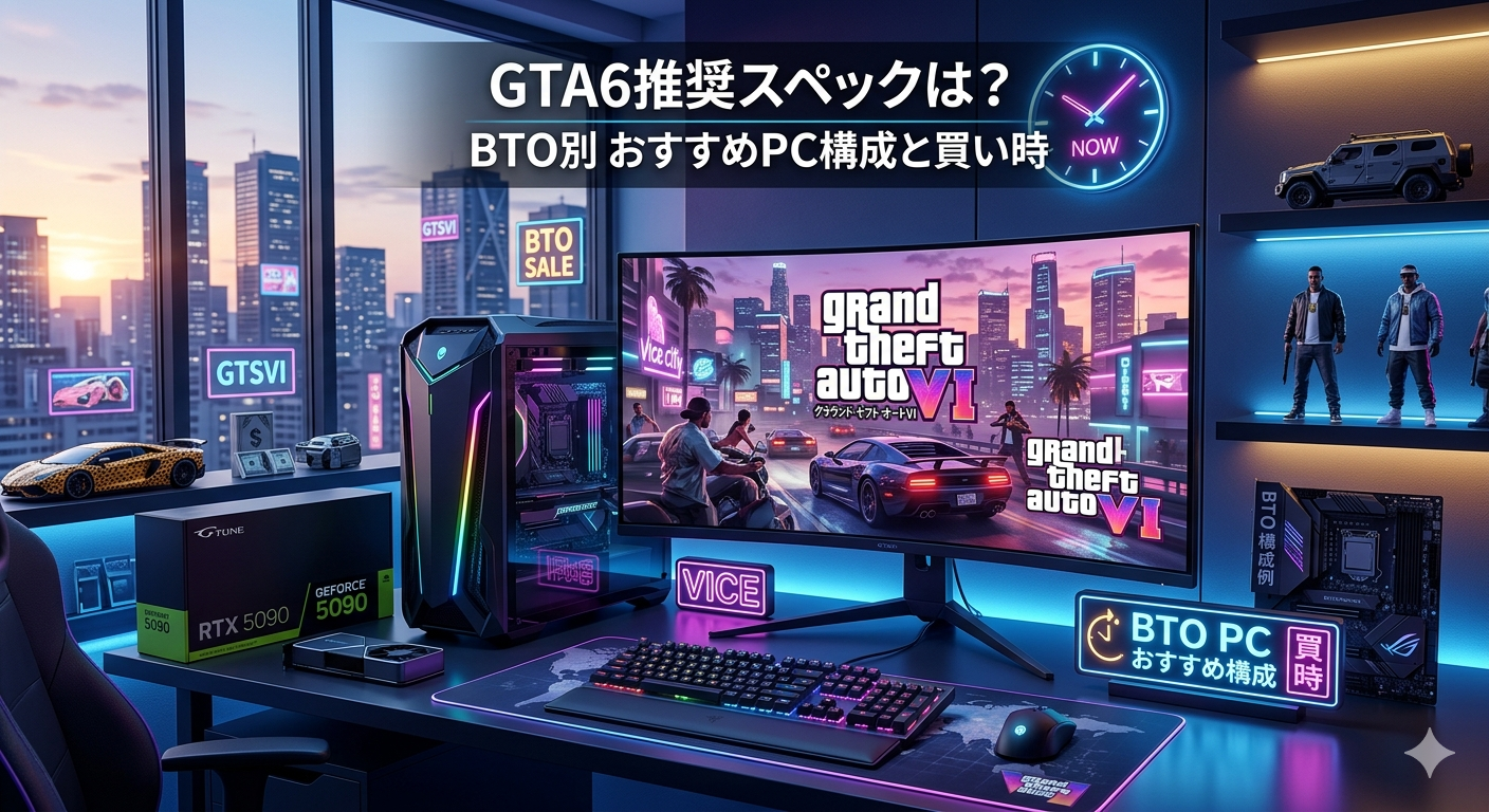 GTA6(グランド・セフト・オートVI)のPC版に向けて「どのくらいのスペックが必要なのか」「今のうちにゲーミングPCを買っておくべきか」と気になっている方は多いはず。本記事では、過去作やモンハンワイルズのスペック傾向をもとにGTA6 PC版の推奨スペックを予想し、予算別のおすすめBTOゲーミングPC・パーツ選びのポイント・買い時の判断基準まで一本にまとめました。